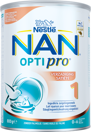 NAN® Verzadiging 1 is een ingedikte eerste leeftijdsmelk die ontwikkeld werd op basis van Nestlé-onderzoek. Deze melk sluit vanaf de geboorte perfect aan bij de specifieke voedingsbehoeften van baby's die geen borstvoeding krijgen.