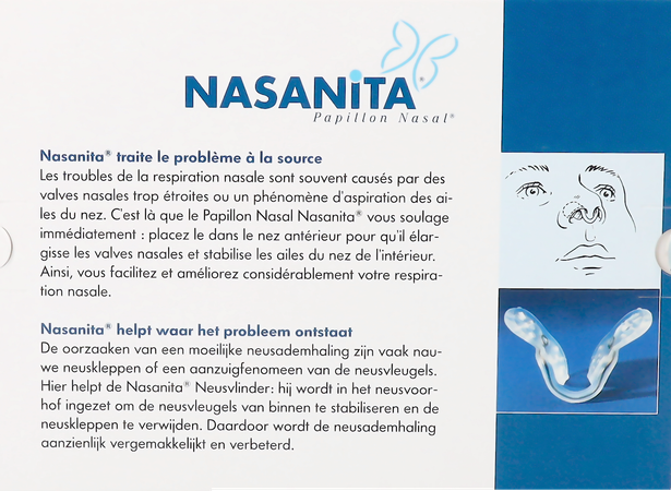Veel mensen lijden aan een verminderde neusademhaling vanwege smalle neus kleppen of instabiel neus vleugels. De Nasanita Nose Butterfly ® zal u helpen: U voegt het gewoon in de voorste regio van je neus. De flexibele siliconen vleugels passen zich optimaal aan de vorm van je neus, de nasale kleppen uit te breiden en te stabiliseren uw neus vleugels van de binnenkant.