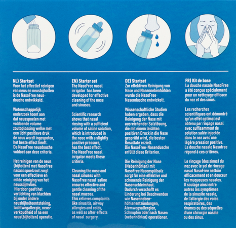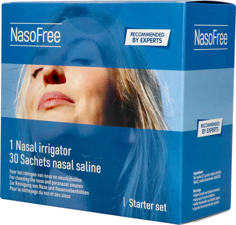 De NasoFree Neusdouche Startset met nasaal spoelzout is ideaal om je neus en neusbijholten mee te reinigen. Verlicht klachten door bijvoorbeeld een verkoudheid, bijholteontsteking of hooikoorts.