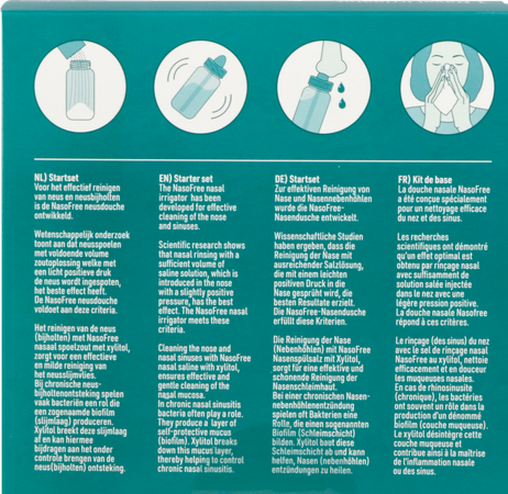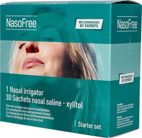 De NasoFree Neusdouche Startset met nasaal spoelzout met xylitol is speciaal ontwikkeld voor mensen met chronische neusbijholteontsteking. Haal opgelucht adem en geniet van verfrissing door het vleugje mint.