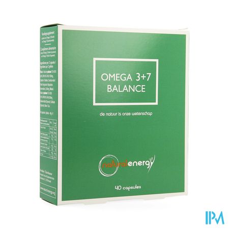 Omega 3+7 Balance Caps 40 Natural Energy is een voedingssupplement, verkrijgbaar in uw buurtapotheek of online apotheek. Neem niet meer dan de aanbevolen dagelijkse dosis vermeld op de verpakking. Het vervangt geen gezonde levensstijl en gevarieerde en evenwichtige voeding. Vraag raad aan uw apotheker. Het product altijd buiten het bereik van kinderen houden.