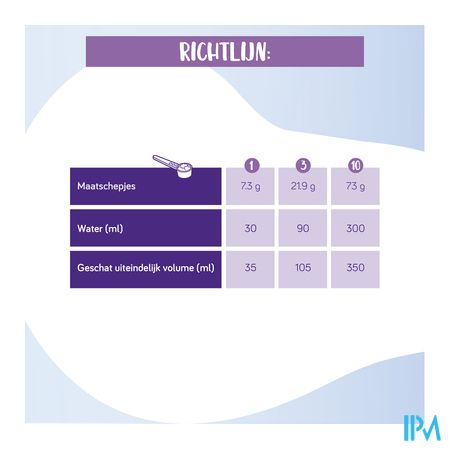 De hoeveelheid en concentratie van de voeding moet door een arts of diëtist worden vastgesteld en is afhankelijk van leeftijd, gewicht en medische conditie van de patiënt. Een afgestreken maatschepje levert 7,3 g poeder. Voeg 1 maatschepje poeder toe aan 30 ml water. Indien bereid, in koelkast bewaren en binnen 24 uur consumeren. Direct voor gebruik schudden of roeren. Geopende verpakking binnen 1 maand gebruiken.