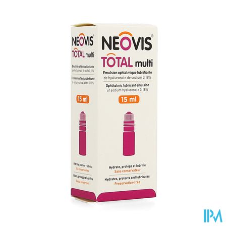 NEOVIS TOTAL multi is een bevochtigende oogoplossing die wordt aangeboden in de vorm van een steriele hypo-osmolaire emulsie met 0,189s natriumhyaluronaat Iverkregen door middel van fermentatie]. NE0VIS%* TOTAL multi bevat geen bewaarmiddel en is verkrijgbaar in een multidosisflesje van 15 ml.