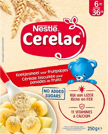 Nestlé CERELAC is een reeds gemalen granenkoekje, gemakkelijk af te meten en te vermengen met de fruitpap om voorzichtig gluten te introduceren in de voeding van uw baby. Het biedt een ideale variatie op brood en is rijk aan Calcium, Vitamine D en Zink. Het hoge ijzergehalte dekt reeds 50% van de dagelijkse aanbevolen hoeveelheid ijzer. IJzer draagt bij aan het immuunsysteem en de cognitieve ontwikkeling van uw baby.