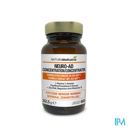 Neuro-ad Concentratie Pot Caps 60 is een voedingssupplement, verkrijgbaar in uw buurtapotheek of online apotheek. Neem niet meer dan de aanbevolen dagelijkse dosis vermeld op de verpakking. Het vervangt geen gezonde levensstijl en gevarieerde en evenwichtige voeding. Vraag raad aan uw apotheker. Het product altijd buiten het bereik van kinderen houden.
