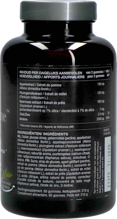 Glucosestroop, suiker, geleermiddel (gelatine van rund), water, appelextract (Malus domestica Borkh.), appelsapconcentraat, gierstextract (Panicum miliaceum L.), paardenstaart extract (Equisetum arvense L.), zuurteregelaar (citroenzuur), verdikkingsmiddel (agar), natuurlijk appelaroma, kleurstof (bieten), zinkcitraat, biotine.