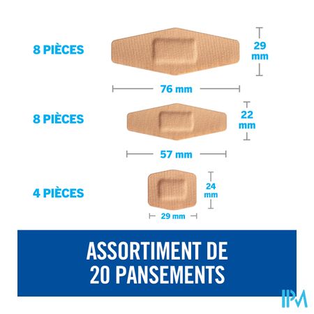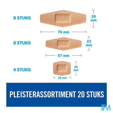 - Eén verpakking bevat 20 pleisters: 4 stuks van 24 x 29 mm, 8 stuks van 22 x 57 mm en 8 stuks van 29 x 76 mm