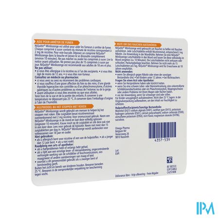NiQuitin® Clear Patch en NiQuitin® Minilozenge zijn geneesmiddelen en bevatten nicotine. Lees aandachtig de bijsluiter. Geen langdurig gebruik zonder geneeskundig advies. Buiten bereik en zicht van kinderen bewaren. Geen gebruik voor kinderen jonger dan 12 jaar. Geen gebruik door niet-rokers. NiQuitin® Minilozenge mag door jongeren (12 t/m 17 jaar) alleen gebruikt worden op advies van een arts of apotheker. Geen gebruik van NiQuitin® Clear Patch door occasionele rokers. Vermijd het roken tijdens het gebruik. Combitherapie is enkel bij volwassenen toegestaan. Enkel NiQuitin® Clear Patch mag gecombineerd worden met één andere orale vorm. Gebruik dezelfde dosering als bij monotherapie. Vraag raad aan uw apotheker. Perrigo Belgium NV