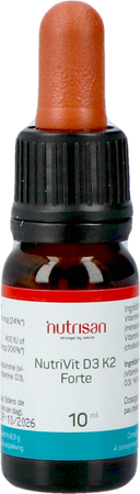 Nutrivit D3 K2 Forte 10ml Nutrisan is een voedingssupplement, verkrijgbaar in uw buurtapotheek of online apotheek. Neem niet meer dan de aanbevolen dagelijkse dosis vermeld op de verpakking. Het vervangt geen gezonde levensstijl en gevarieerde en evenwichtige voeding. Vraag raad aan uw apotheker. Het product altijd buiten het bereik van kinderen houden.