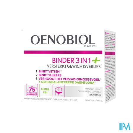 OENOBIOL BINDER 3IN1+ 60 CAPS is een voedingssupplement, verkrijgbaar in uw buurtapotheek of online apotheek. Neem niet meer dan de aanbevolen dagelijkse dosis vermeld op de verpakking. Het vervangt geen gezonde levensstijl en gevarieerde en evenwichtige voeding. Vraag raad aan uw apotheker. Het product altijd buiten het bereik van kinderen houden.
