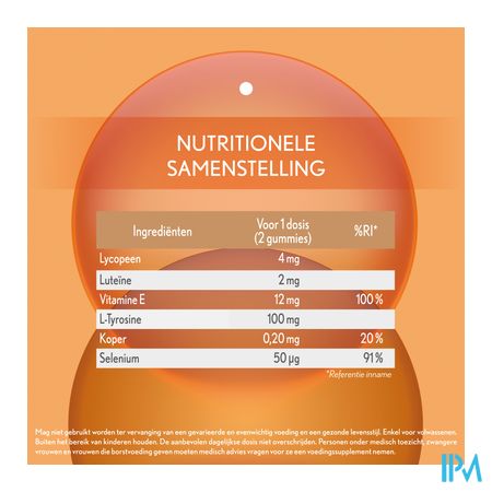 Vulstof: maltitolen - stabilisator: maltitol - L-tyrosine, geleermiddel: pectinen - voedingszuren: citroenzuur, appelzuur, natriummalaten, dl-alfatocoferylacetaat, natuurlijke aroma, lycopeen, natuurlijk citroenaroma met andere natuurlijke aroma's -natriumseleniet -voedingszuur : natriumcitraten –luteïne - concentraat van saffloer (Carthamus tinctorius L.) en radijs (Raphanus sativus L.) - kopercitraat.