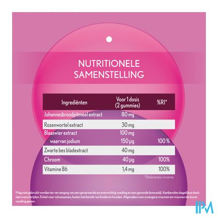 Vulstof: maltitolen – fucus droogextract (Fucus vesiculosus L.) – natuurlijk aroma – johannesbroodboomextract (Ceratonia siliqua L.) – geleermiddel : pectinen – zwarte aalbes extract (Ribes nigrum L.) - voedingszuur: citroenzuur- rozenwortelextract (Rhodiola rosea L.) – voedingszuur: natriumcitraten – concentraat van wortel (Daucus carota L.) en zwarte aalbes (Ribes nigrum L.) – glansmiddel: carnaubawas - pyridoxine hydrochloride - chroompicolinaat.