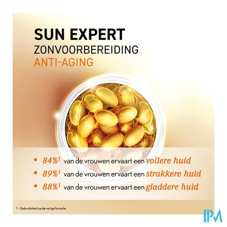 SUN EXPERT Zonvoorbereiding Anti-Aging biedt een drievoudig belofte: de huid voorbereiden op blootstelling aan de zon met een aangepaste cellulaire anti-oxidantbescherming², een intense & stralende zongebruinde huid, en de stevigheid en soepelheid van de huid bevorderen.