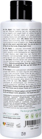 Regelmatig baden kan de babyhuid uitdrogen. Daarom verzacht onze biologische en natuurlijke badolie het badwater. Dankzij de rijke mix van thermaal water en biologische zonnebloemolie reinigt en hydrateert het de huid en laat het een ultra zacht voedend laagje op je baby's huid. Oh, Baby! Badolie bevat ook prebiotica en probiotica die de natuurlijke beschermlaag van je baby's huid versterken en herstellen.