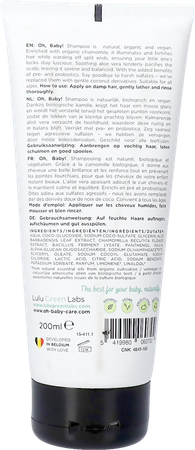Oh, Baby! Shampoo is natuurlijk, biologisch en vegan. Verrijkt met biologische kamille, krijgt het haar een mooie glans en wordt het versterkt terwijl het gespleten punten voorkomt. Kalmerende aloë vera verzacht de hoofdhuid, waardoor deze rustig en in balans blijft. Dankzij pre- en probiotica helpt deze zachte shampoo melkkorstjes of berg te voorkomen.