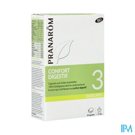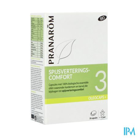 De moderne mens zit elke dag in een grote maalstroom: stress, werk, gezin, vrije tijd... Hij rent zichzelf voorbij! Deze manier van leven ""op maximale snelheid"" brengt slechte eetgewoontes met zich mee: we eten snel, te vet, onvenwichtig, zittend voor een beeldscherm zonder een pauze te nemen om het eten te verteren, .... met als gevolg: spijsverteringsproblemen, maagklachten, misselijkheid, een opgezette buik... Oléocaps+ 3 BIO capsules op basis van essentiële oliën van Pepermunt, Kardemom, Gember, Chinese Kaneel, Karwijzaad en Citroen helpen bij spijsverteringsproblemen maar ook om de gevolgen van zware maaltijden en reisziekte te voorkomen.