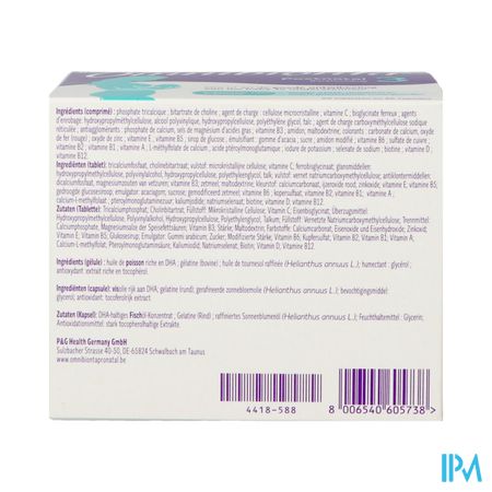 Ingrediënten (tablet): tricalciumfosfaat, cholinebitartraat; vulstof: microkristallijne cellulose; vitamine C, ferrobisglycinaat; glansmiddelen: hydroxypropylmethylcellulose, polyvinylalcohol, hydroxypropylcellulose, polyethyleenglycol, talk; vulstof: vernet natriumcarboxymethylcellulose; antiklontermiddelen: calciumfosfaat, magnesiumzouten van vetzuren; vitamine B3; zetmeel; maltodextrine; kleurstof: calciumcarbonaat, ijzeroxide rood; zinkoxide; vitamine E, vitamine B5; glucosestroop; emulgator: acaciagom; suiker; gemodificeerd zetmeel; vitamine B6; kopersulfaat; vitamine B2; vitamine B1; vitamine A; calcium-L-methylfolaat; pteroylmonoglutaminezuur; kaliumjodide, natriumseleniet; biotine, vitamine D; vitamine B12.