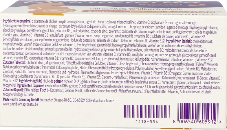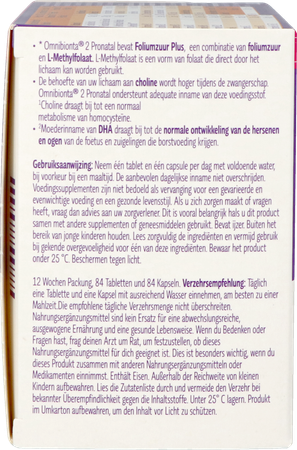 De behoefte van uw lichaam aan choline wordt hoger tijdens de zwangerschap Omnibionta 2 Pronatal ondersteunt adequate inname van deze voedingsstof. Choline draagt bij tot een normaal metabolisme van homocysteine.