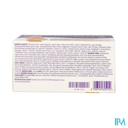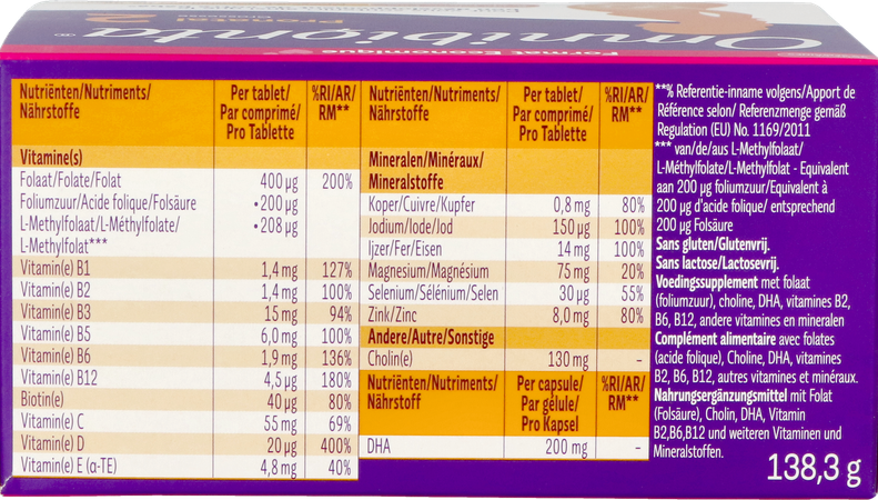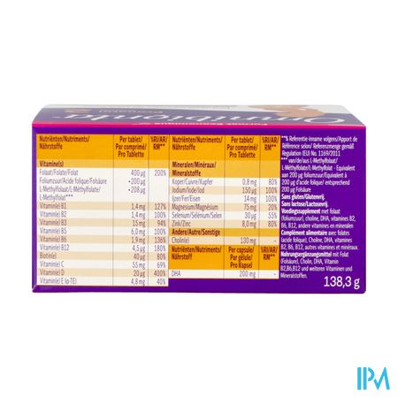 Ingrediënten (tabletten): cholinébitartraat; magnesiumoxide; vulstof: microkristallijne cellulose; vitamine C; ijzerbisglycinaat; glansmiddel: hydroxypropylmethylcellulose; vulstof: vernet natriumcarboxymethylcellulose; antiklontermiddel: dicalciumfosfaat; zetmeel; glansmiddel: hydroxypropylcellulose, polyvinylalcohol, polyethyleenglycol, talk; vitamine B3; maltodextrine; zinkoxide; kleurstoffen: calciumcarbonaat, ijzeroxide rood; antiklontermiddel: magnesiumzouten van vetzuren; vitamine E; vitamine B5; emulgator: acaciagom; sucrose; gedroogde glucosestroop; gemodificeerd zetmeel; vitamine B6; kopersulfaat; vitamine B1; vitamine B2; calcium-L-methylfolaat; pteroylmonoglutaminezuur; kaliumjodide; natriumselenaat; d-biotine; vitamine D; vitamine B12.