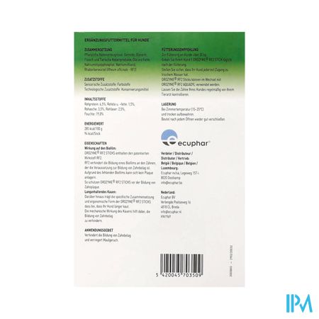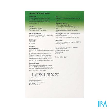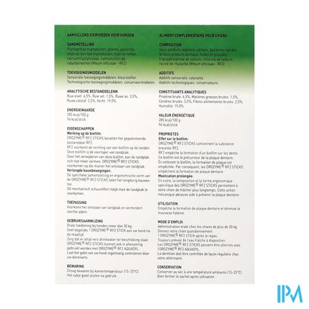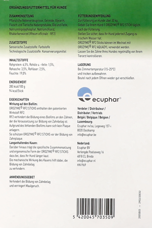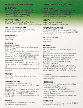 De samenstelling, de structuur en de vorm van de Orozyme RF2 Sticks zorgen voor een mechanisch schuureffect zodat de tanden tot op de tandvleeslijn gereinigd worden. De sticks bevatten een aanvaardbare hoeveelheid calorieën: Small 35 kcal, Medium 63 kcal en Large 90 kcal.