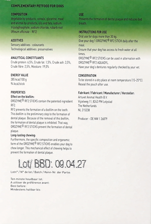 Orozyme RF2 Sticks helpen tandplak en slechte adem voorkomen. De sticks zijn plantaardig en bevatten het actieve ingrediënt RF2, een unieke actieve formule die de vorming van tandaanslag (biofilm) op de tanden aanduidend vermindert en een slechte adem van de hond aanpakt.