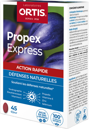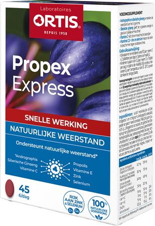 Ortis Propex Express Comp 45 is een voedingssupplement, verkrijgbaar in uw buurtapotheek of online apotheek. Neem niet meer dan de aanbevolen dagelijkse dosis vermeld op de verpakking. Het vervangt geen gezonde levensstijl en gevarieerde en evenwichtige voeding. Vraag raad aan uw apotheker. Het product altijd buiten het bereik van kinderen houden.