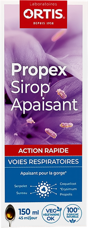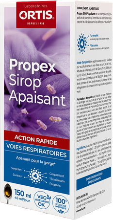 Ortis Propex Verzachtende Siroop 150ml is een voedingssupplement, verkrijgbaar in uw buurtapotheek of online apotheek. Neem niet meer dan de aanbevolen dagelijkse dosis vermeld op de verpakking. Het vervangt geen gezonde levensstijl en gevarieerde en evenwichtige voeding. Vraag raad aan uw apotheker. Het product altijd buiten het bereik van kinderen houden.