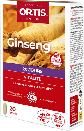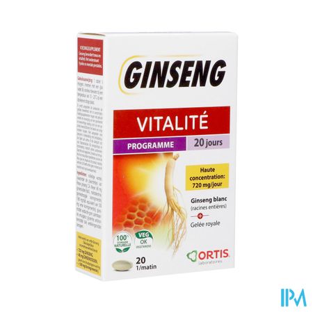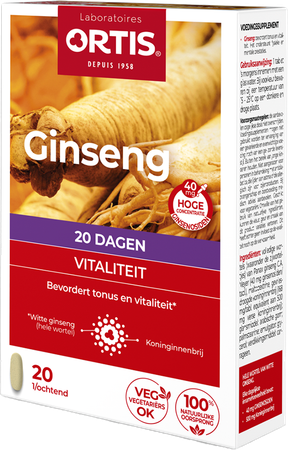 Ortis Vitalite Ginseng 20 Tabl 20 is een voedingssupplement, verkrijgbaar in uw buurtapotheek of online apotheek. Neem niet meer dan de aanbevolen dagelijkse dosis vermeld op de verpakking. Het vervangt geen gezonde levensstijl en gevarieerde en evenwichtige voeding. Vraag raad aan uw apotheker. Het product altijd buiten het bereik van kinderen houden.