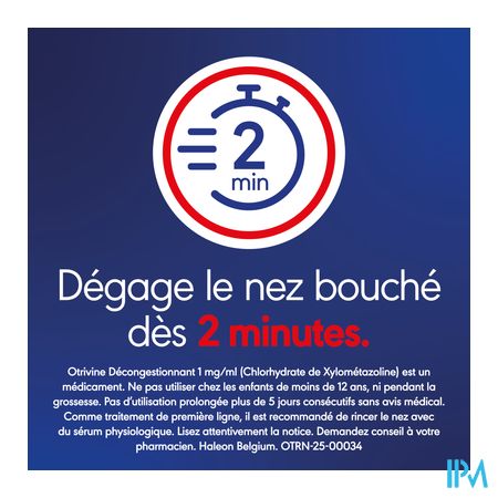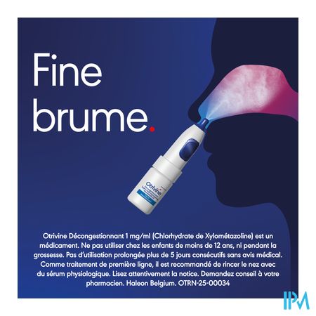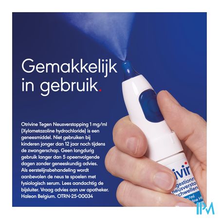 Otrivine maakt deel uit van de groep geneesmiddelen gebruikt bij de behandeling van de symptomen van neusverstopping. Het is aangewezen bij volwassenen en jongeren vanaf 12 jaar.Behandeling van korte duur (maximum 3 à 5 dagen) van de symptomen van neusverstopping bij bepaalde aandoeningen zoals :neusverkoudheid (niet-allergische rhinitis (=ontsteking van het neusslijmvlies), hooikoorts en allergische rhinitis door bijvoorbeeld stof en schimmels, sinusitis (bevordert de uitscheiding van slijmen), ontstekingen van het middenoor. Het effect van Otrivine is waarneembaar binnen 2 minuten en duurt tot 10 uren. Als eerstelijnsbehandeling, is het aangeraden om de neus te spoelen met een fysiologisch serum. Otrivine mag gebruikt worden als tweedelijnsbehandeling. Zoals alle neuspreparaten met een vaatvernauwende stof, mag Otrivine niet als onderhoudsbehandeling gebruikt worden. Wordt uw klacht na 5 dagen niet minder, of wordt hij zelfs erger? Neem dan contact op met uw arts.