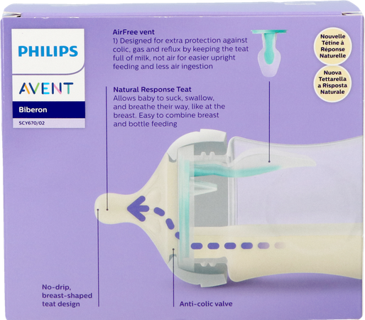 Kalm en comfortabel voeden. De Natuurlijke Zuigreflex-speen ondersteunt het unieke ritme van je baby voor zuigen, doorslikken en ademen. Het AirFree-ventiel is ontworpen om ondertussen lucht weg te houden uit de buik, om krampjes, gas en brandend maagzuur te voorkomen.