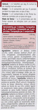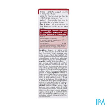 berberine uit Berberis aristata (23,4%), vulstof: cellulose, erwteiwit (Pisum sativum), emulgatoren: zonnebloemlecithine (Helianthus annuus), glycerol, druivenpitextract (Vitis vinifera), glansmiddel: vetzuren, antiklontermiddelen: calciumcarbonaat, tricalciumfosfaat, geleermiddel: hydroxypropylmethylcellulose, chroompicolinaat.