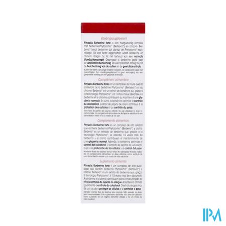 Physalis Berberine forte is een hoogwaardig complex met berberine-Phytosome® (Berbevis®) en chroom. Berbevis® bevat berberine dat dankzij de Phytosome®-technologie 10 keer beter opgenomen wordt. Berberine en chroom dragen bij tot het behoud van een normale bloedsuikerspiegel. Daarnaast is berberine goed voor de cholesterolbeheersing. Druivenpitextract draagt bij tot de bescherming van de cellen en de gewichtscontrole.