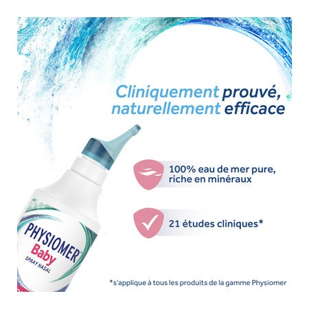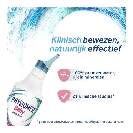 Physiomer Baby is een natuurlijke neusspray die op milde wijze de verstopte neus en loopneus bij baby's reinigt en verlicht, veroorzaakt door verkoudheid. Het biedt een drievoudige werking (3-in-1): het maakt de verstopte neus vrij, helpt daardoor slijm, virussen en bacteriën te verwijderen. Het verlicht neusklachten. Het herstelt de normale ademhaling en versnelt het herstel. Gemaakt met 100% puur zeewater, is deze isotone oplossing zorgvuldig samengesteld om de neuspassages te reinigen en je baby weer vrij te laten ademen. De unieke fles heeft een zachte nevel en een comfort tip rond het mondstuk, speciaal ontworpen om perfect in het neusgat van de baby te passen en letsel te voorkomen. Physiomer Baby reinigt en verlicht de verstopte en loopneus met 100% onverdund isotoon zeewater. Physiomer Baby Neusspray onderscheidt zich van gangbare medicinale oplossingen. De unieke samenstelling verlicht niet alleen symptomen, maar ondersteunt ook de natuurlijke functie van het neusslijmvlies, zonder de ernstige bijwerkingen die vaak voorkomen bij veel geneesmiddelen. Klinisch onderzoek en erkenning door experts bevestigen deze 3-in-1 aanpak, waarmee Physiomer een toonaangevende, natuurlijke oplossing biedt die effectief én zacht is voor gebruikers.