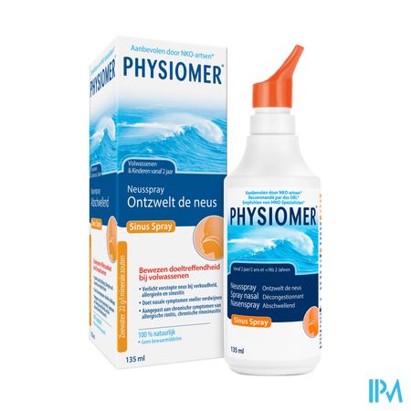 PHYSIOMER® Sinus Spray is een neusspoeling die is aanbevolen voor het ontzwellen en verminderen van een verstopte neus. Dankzij de hoge zoutconcentratie in de formule wordt het teveel aan vocht uit het neusslijmvlies onttrokken en het vermindert overmatig slijm.