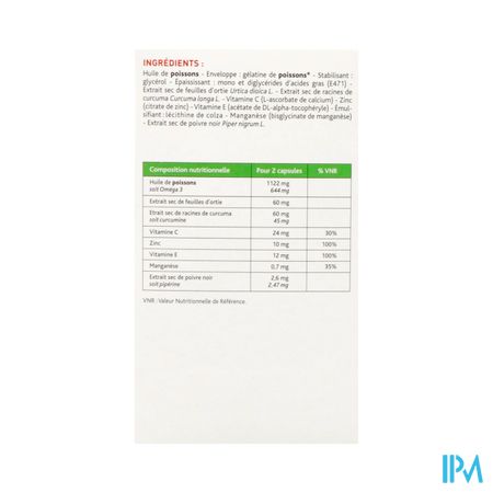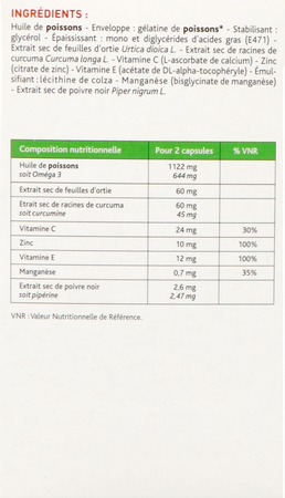 Ingrediënten: Visolie - Omhulsel: visgelatine* - Stabilisator: glycerol - Verdikkingsmiddel: mono- en diglyceriden van vetzuren (E471) - Droog extract van brandnetelbladeren Urtica dioica L. - Droog extract van kurkumawortels Curcuma longa L. - Vitamine C (calcium L-ascorbaat) - Zink (zinkcitraat) - Vitamine E (DL-alfa-tocoferylacetaat) - Emulgator: koolzaadlecithine - Mangaan (mangaanbisglycinaat) - Gedroogd zwart peperextract Piper nigrum L.