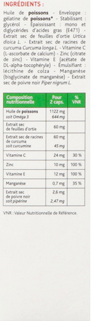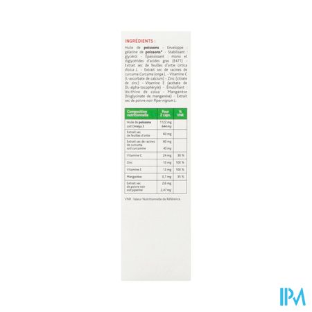 Ingrediënten: Visolie - Omhulsel: visgelatine* - Stabilisator: glycerol - Verdikkingsmiddel: mono- en diglyceriden van vetzuren (E471) - Droog extract van brandnetelbladeren Urtica dioica L. - Droog extract van kurkumawortels Curcuma longa L. - Vitamine C (calcium L-ascorbaat) - Zink (zinkcitraat) - Vitamine E (DL-alfa-tocoferylacetaat) - Emulgator: koolzaadlecithine - Mangaan (mangaanbisglycinaat) - Gedroogd zwart peperextract Piper nigrum L.