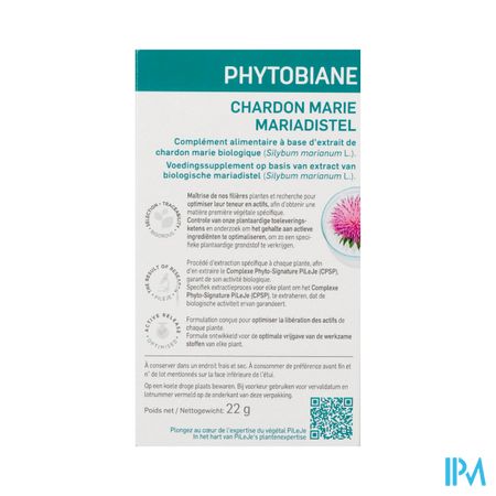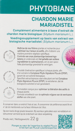 Phytobiane Mariadistel Tabl 30 is een voedingssupplement, verkrijgbaar in uw buurtapotheek of online apotheek. Neem niet meer dan de aanbevolen dagelijkse dosis vermeld op de verpakking. Het vervangt geen gezonde levensstijl en gevarieerde en evenwichtige voeding. Vraag raad aan uw apotheker. Het product altijd buiten het bereik van kinderen houden.