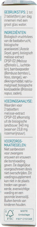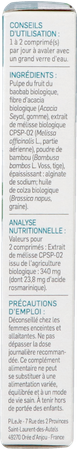 Biologische Baobab Fruit Pulp (Adansonia digitata L.), Biologische Acacia Vezel, Biologische Citroenmelisse Extract CPSP-02 (Melissa officinalis L., blad), Bamboe Poeder (Bambusa bambos L. Voss, exsudaat), Verdikkingsmiddel: Natriumalginaat; biologische koolzaadolie.