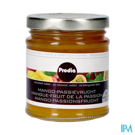 Prodia Extra confituur mango-passievrucht bevat meer stukjes, gezoet met maltitol.