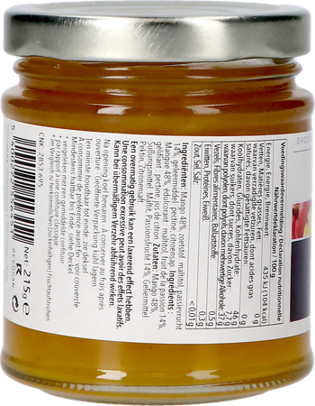 Ingrediënten: Mango 48%, zoetstof: maltitol, passievrucht 14%, geleermiddel: appelpectine, citroensap.
