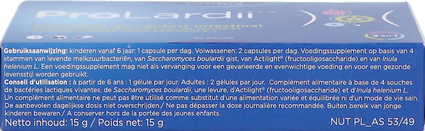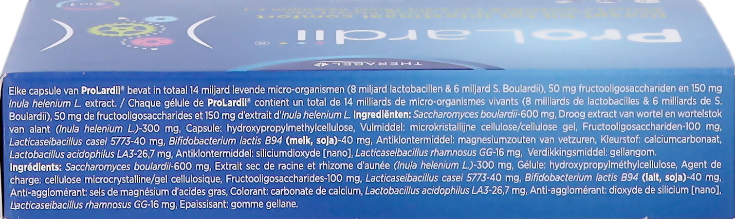 Elke capsule van ProLardii® bevat in totaal 14 miljard levende micro-organismen, 50 mg Actilight® en 150 mg droog extract van Inula helenium L.