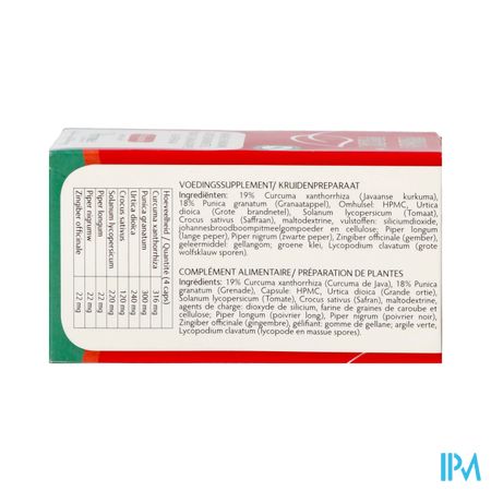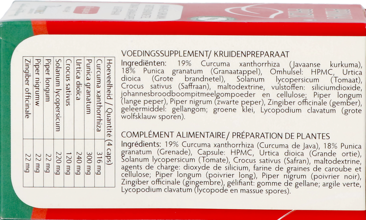 Grote brandnetel, javaanse kurkuma, tomaat, granaatappel, saffraan. Hulpstoffen: maltodextrine, colloïdaal siliciumdioxide, groene klei, johannesbroodpitmeelpoeder, Lycopodium clavatum (sporen van clubmos) en microkristallijne cellulose. Capsule omhulsel: hydroxypropylmethylcellulose.