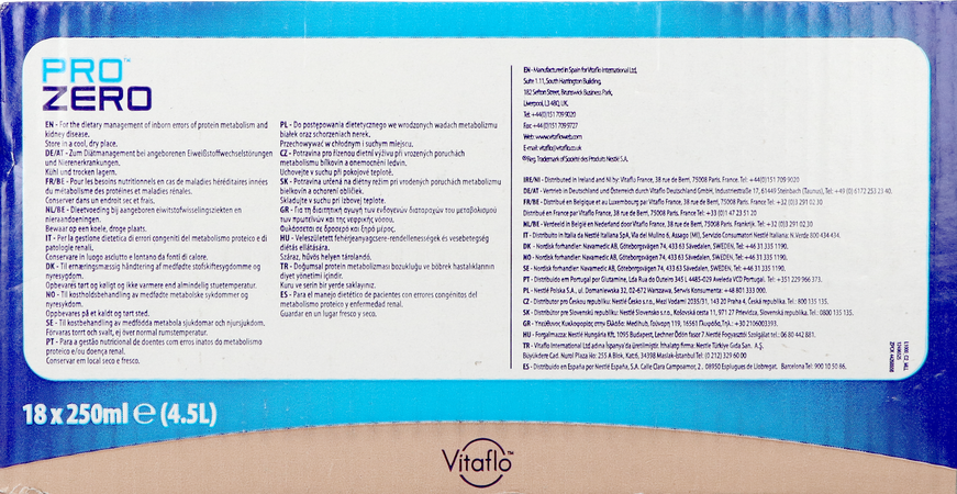 Een eiwitvrije drank die kan gebruikt worden zoals melk, voor gebruik als dieetvoeding bij aangeboren ziekten in het eiwitmetabolisme en nierziekten, voor kinderen en volwassenen met een eiwitbeperkt dieet. ProZero kan alleen worden gebruikt of gemakkelijk worden verwerkt in een groot aantal zoete en hartige recepten. ProZero is verkrijgbaar in 2 smaken: niet-gearomatiseerd, voor kinderen vanaf 6 maanden en chocolade smaak, voor kinderen vanaf 3 jaar.