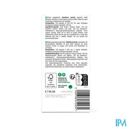 Arabische gom* (Acacia Senegal): 150 mg, meidoornextract* (bloem en blad, Europa of Egypte): 100 mg, capsule: vegetarisch geleermiddel (hydroxypropylmethylcellulose). *Afkomstig van biologische landbouw.