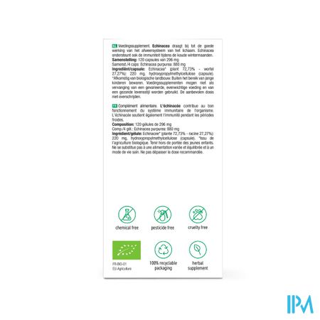 Echinacea* (plant 72,73% - wortel 27,27%): 220 mg, hydroxypropylmethylcellulose (capsule) *Afkomstig van biologische landbouw.