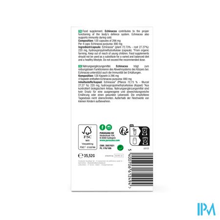Purasana Echinacea Bio Caps 120 is een voedingssupplement, verkrijgbaar in uw buurtapotheek of online apotheek. Neem niet meer dan de aanbevolen dagelijkse dosis vermeld op de verpakking. Het vervangt geen gezonde levensstijl en gevarieerde en evenwichtige voeding. Vraag raad aan uw apotheker. Het product altijd buiten het bereik van kinderen houden.