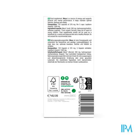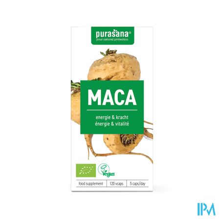 Purasana Maca 300mg Bio V-caps 120 is een voedingssupplement, verkrijgbaar in uw buurtapotheek of online apotheek. Neem niet meer dan de aanbevolen dagelijkse dosis vermeld op de verpakking. Het vervangt geen gezonde levensstijl en gevarieerde en evenwichtige voeding. Vraag raad aan uw apotheker. Het product altijd buiten het bereik van kinderen houden.