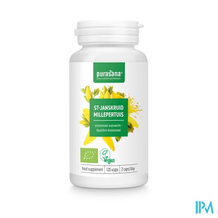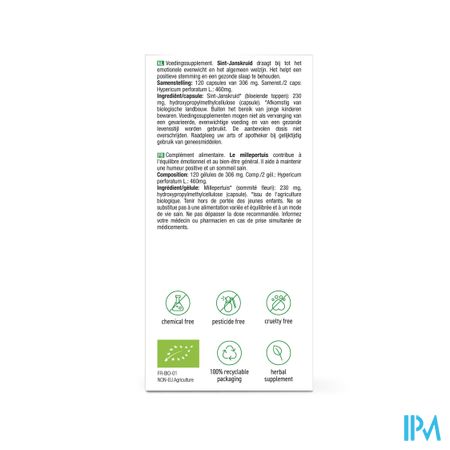 Sint-Janskruid* (bloeiende toppen, Frankrijk): 230 mg. Samenstelling 2 capsules: Hypericum perforatum: 460 mg, capsule: vegetarisch geleermiddel (hydroxypropylmethylcellulose) *Afkomstig van biologische teelt.