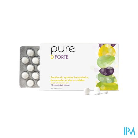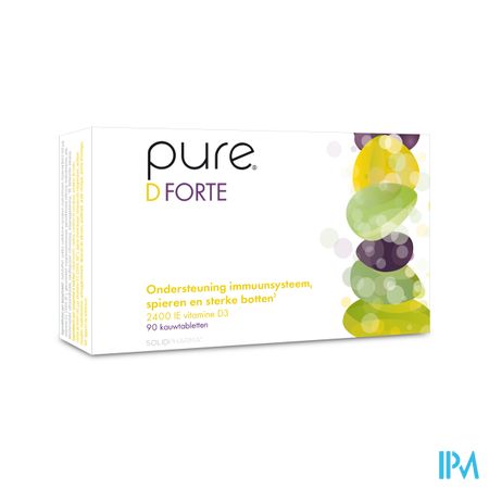 Pure D Forte Kauwtabletten 90 is een voedingssupplement, verkrijgbaar in uw buurtapotheek of online apotheek. Neem niet meer dan de aanbevolen dagelijkse dosis vermeld op de verpakking. Het vervangt geen gezonde levensstijl en gevarieerde en evenwichtige voeding. Vraag raad aan uw apotheker. Het product altijd buiten het bereik van kinderen houden.