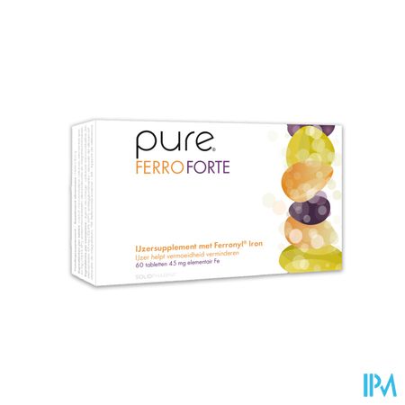 Pure Ferro Forte Tabl 60 is een voedingssupplement, verkrijgbaar in uw buurtapotheek of online apotheek. Neem niet meer dan de aanbevolen dagelijkse dosis vermeld op de verpakking. Het vervangt geen gezonde levensstijl en gevarieerde en evenwichtige voeding. Vraag raad aan uw apotheker. Het product altijd buiten het bereik van kinderen houden.